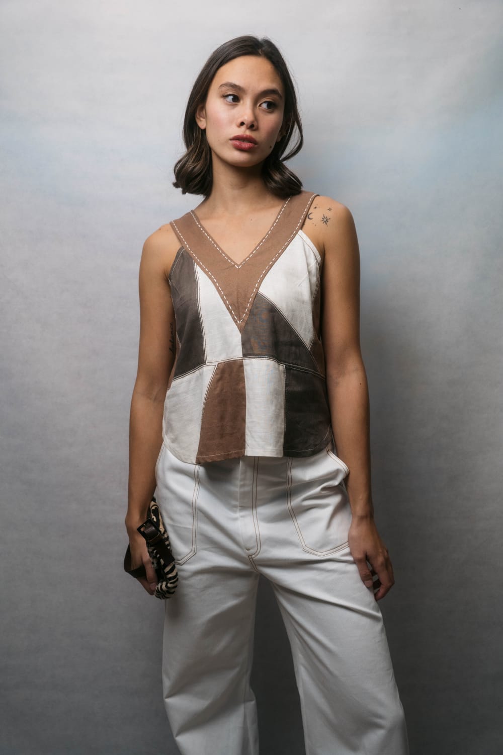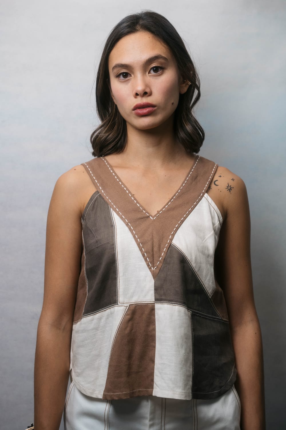 Patchwork of linen. Top stitching and hand stitching detail on the neckline.