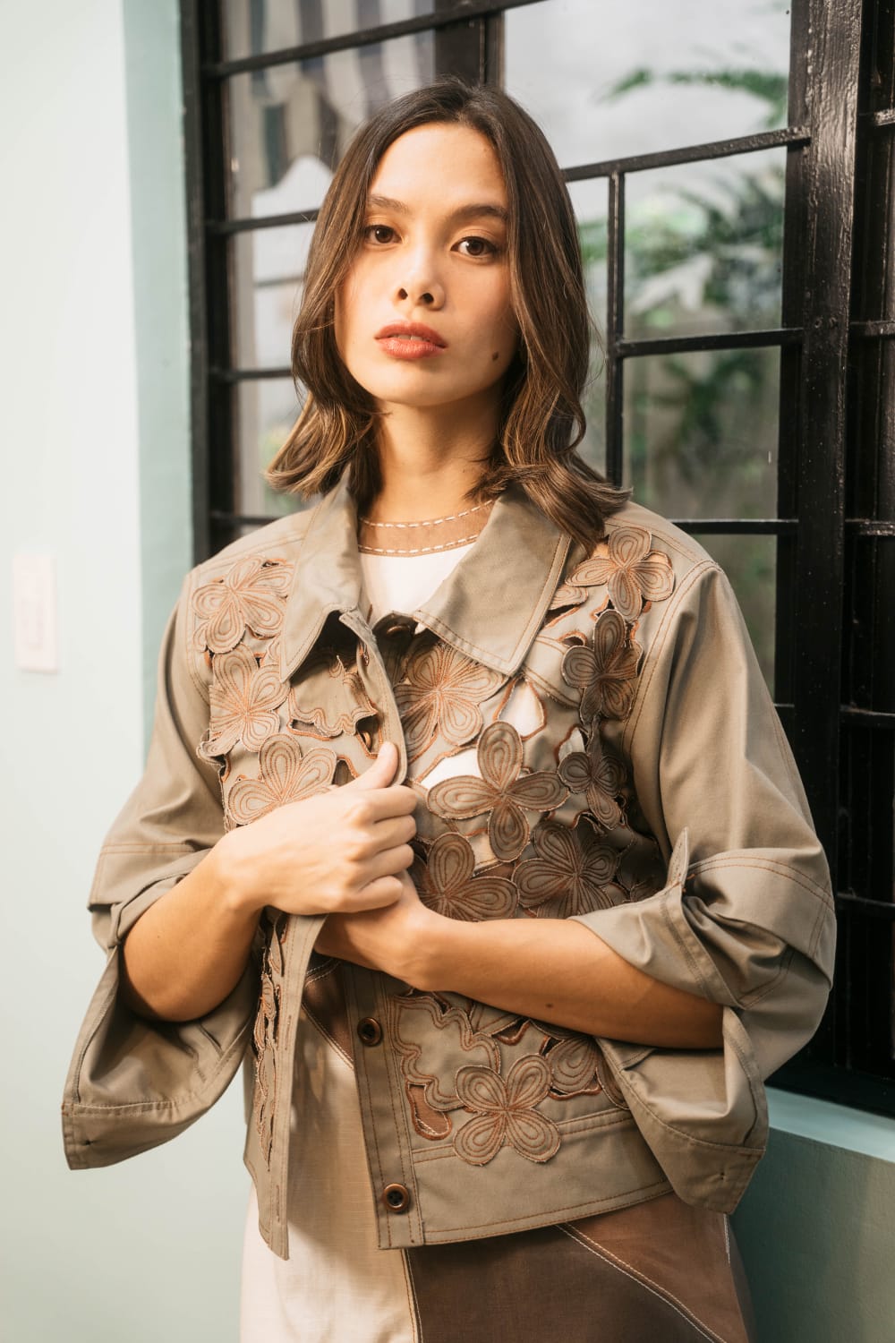 Thick cotton appliqued with embroidered flowers in contrast thread.