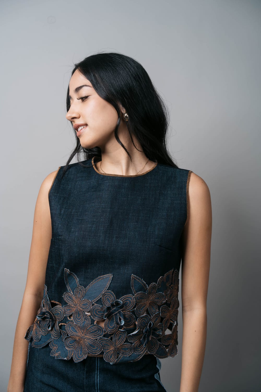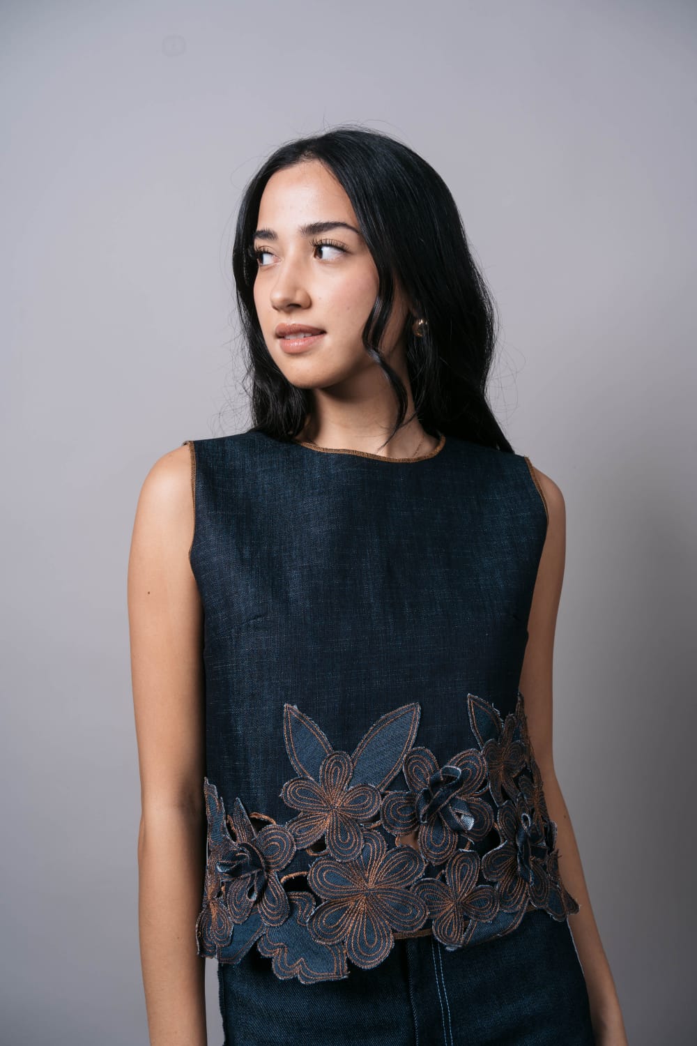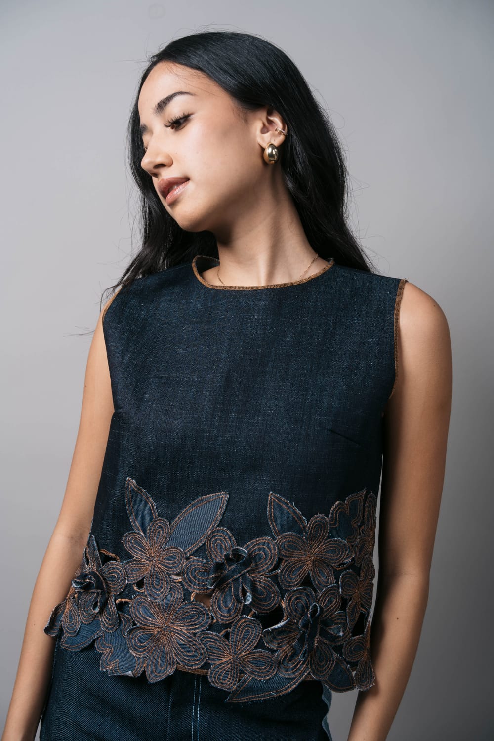 Dark denim appliqued with embroidered flowers in gold thread.